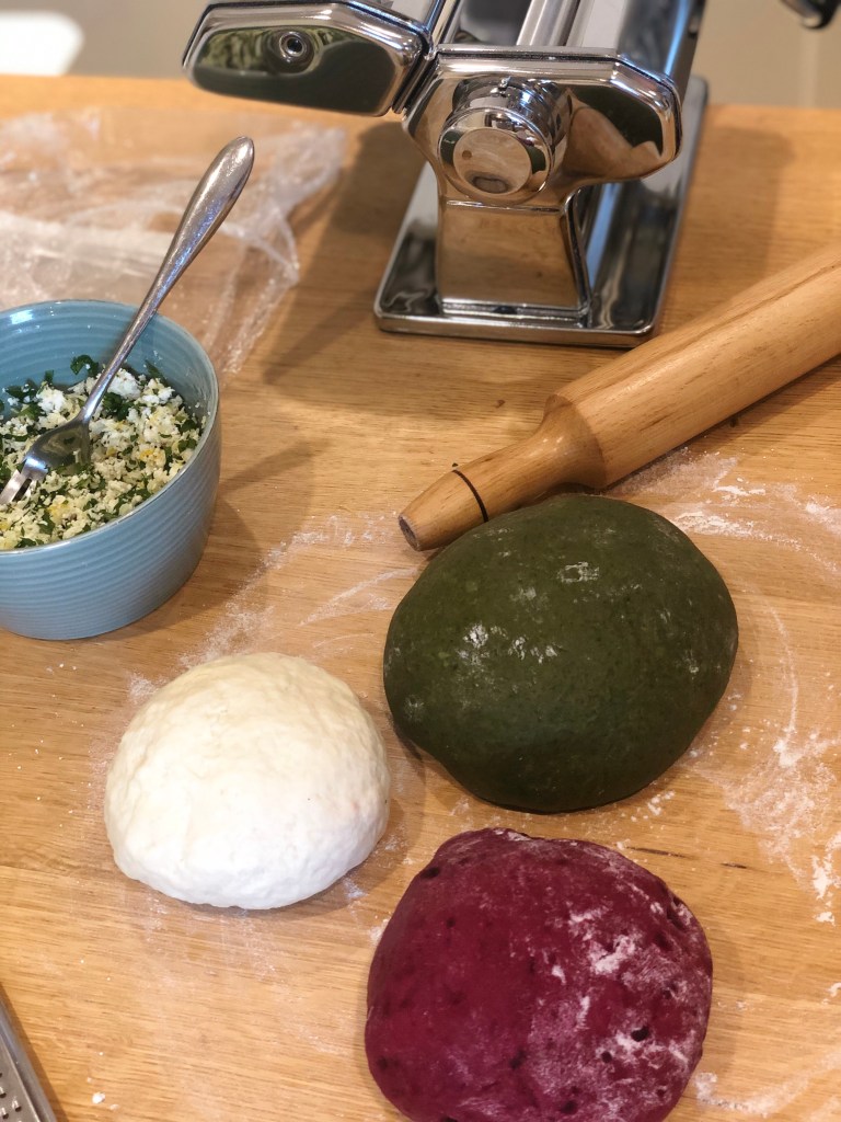 - Hangi renk hamur yapacaksan, un hariç malzemeleri blenderla. Unu tezgaha al, ortasını çukur yap, içine yumurtalı karışımı dikkatlice dök, taşmasın kenarlardan ve çatalla yavaş yavaş undan alarak karıştır. Sonra pamuk eller devreye. 10 dk en az yoğur. Yanında un bulunsun, hamur iyice kuruyana kadar (eline yapışmayana kadar) yoğur. İhtiyaç kadar un ekle.